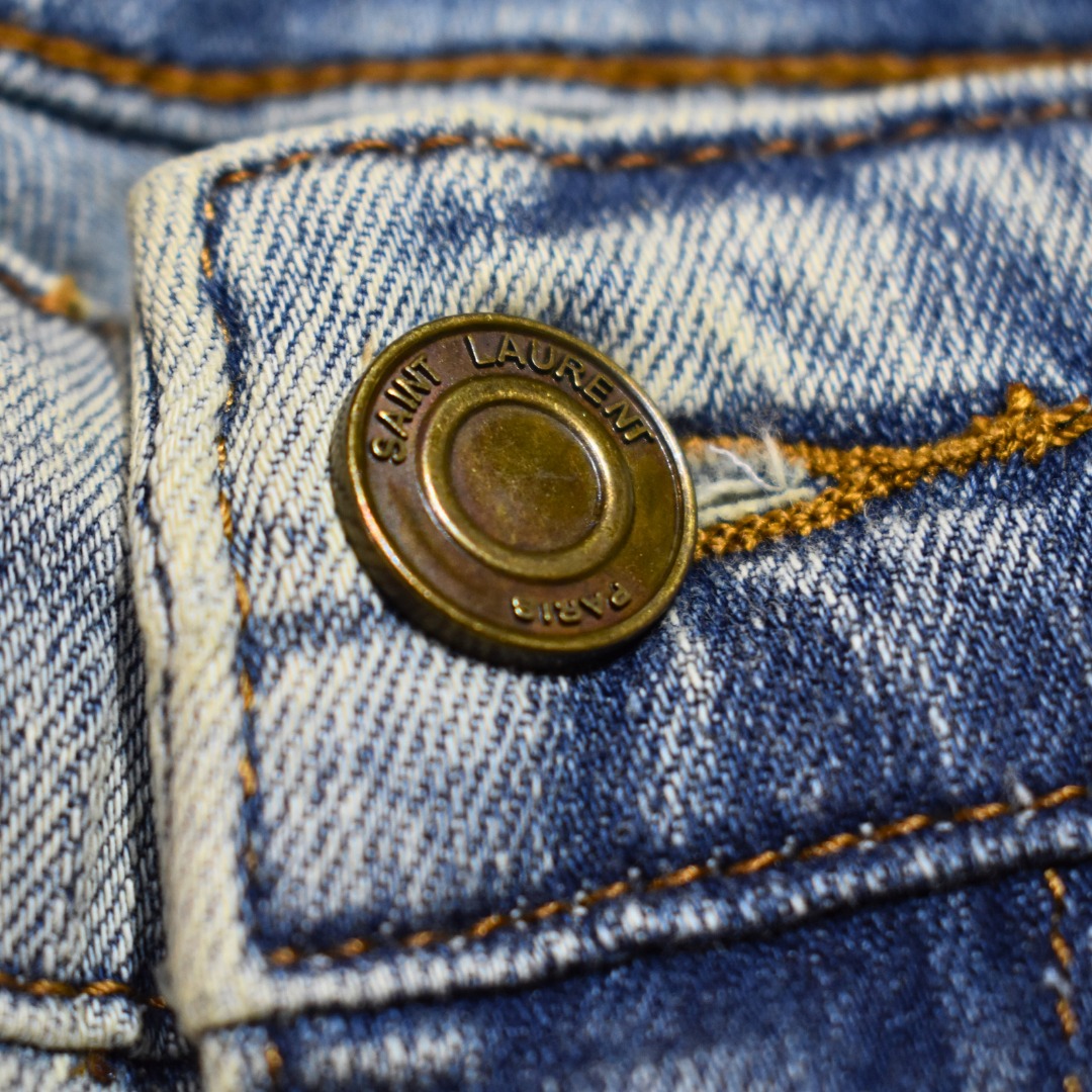 Classic 5-pocket layout with zipper and button closure
